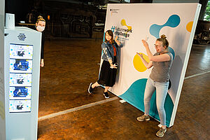Futuristische Fotobox in der DASA: Vom 15. bis 20. Juli können DASA-Gäste in der Stahlhalle kreative Bilder mit digitalen Requisiten erstellen und so am internationalen online-Wettbewerb #futureworkchallenge teilnehmen.
